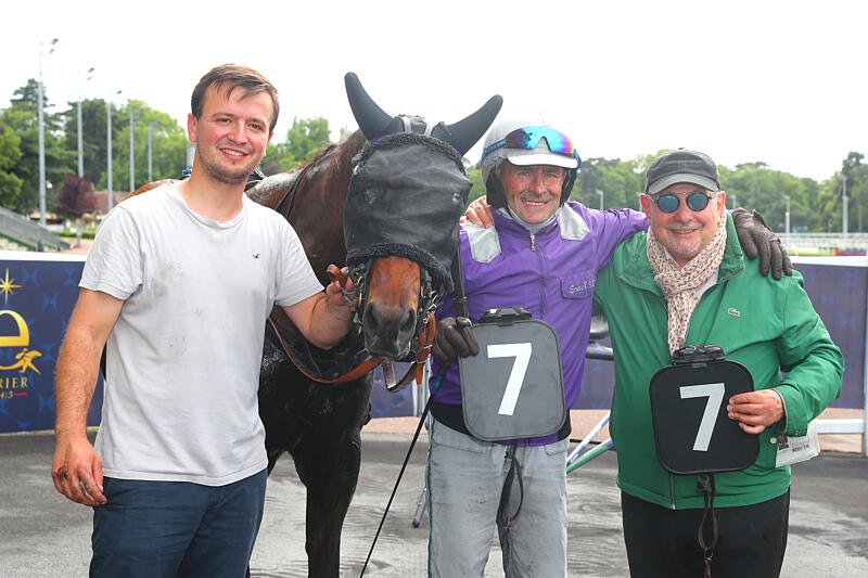 Yves Tillet (à droite) après le 1er succès de sa casaque à Vincennes avec Junko Sept, en juin 2024 … au côté de Jean-François Senet, entraîneur et driver du cheval à l'époque © APRH