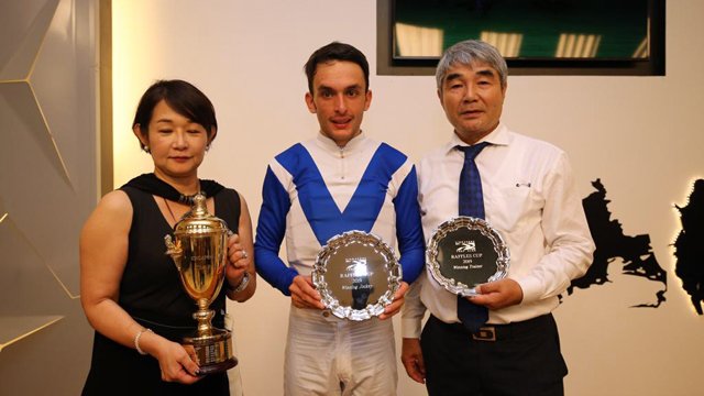 Marc Lerner soulève le trophée de la Raffles Cup, entouré à gauche par Yuki Otani (la propriétaire de Makanani) et à droite par Hideyuki Takaoka (l'entraîneur de la gagnante).