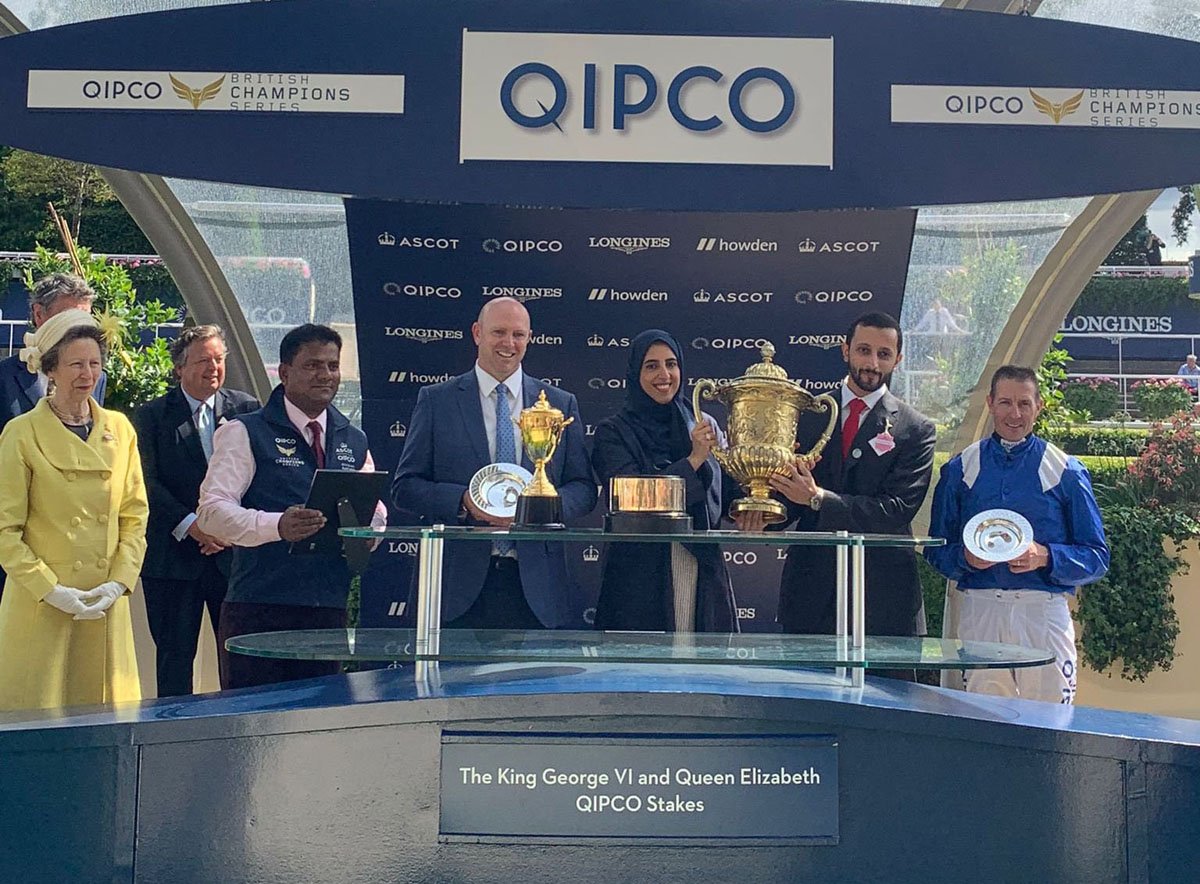 Hissa Hamdan (Shadwell Stud), Owen Burrows et Jim Crowley, récompensés par la Princesse Anne, après le succès d'Hukum dans l'édition 2023 des King George VI and Queen Elizabeth Stakes (Gr.1) (© Twitter GBRI)