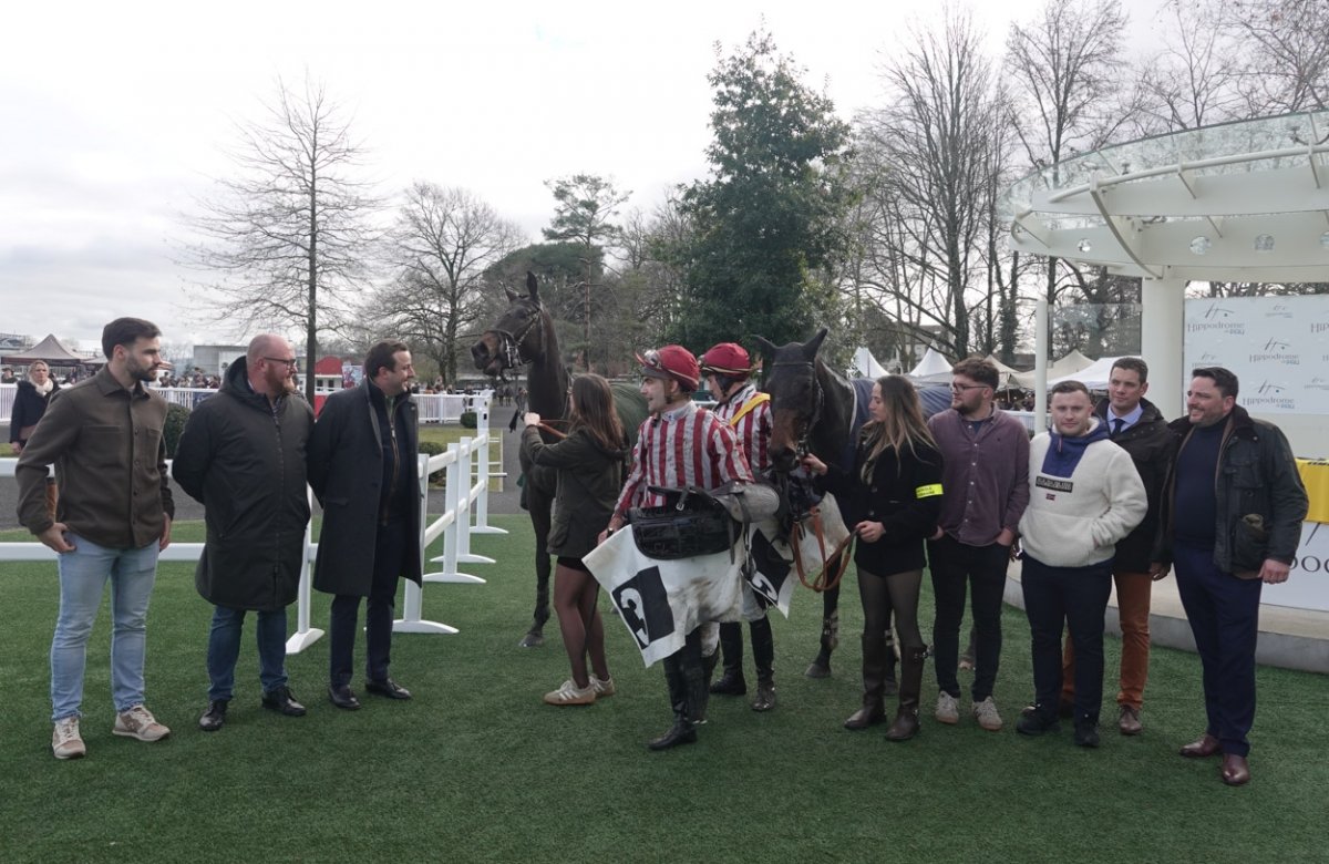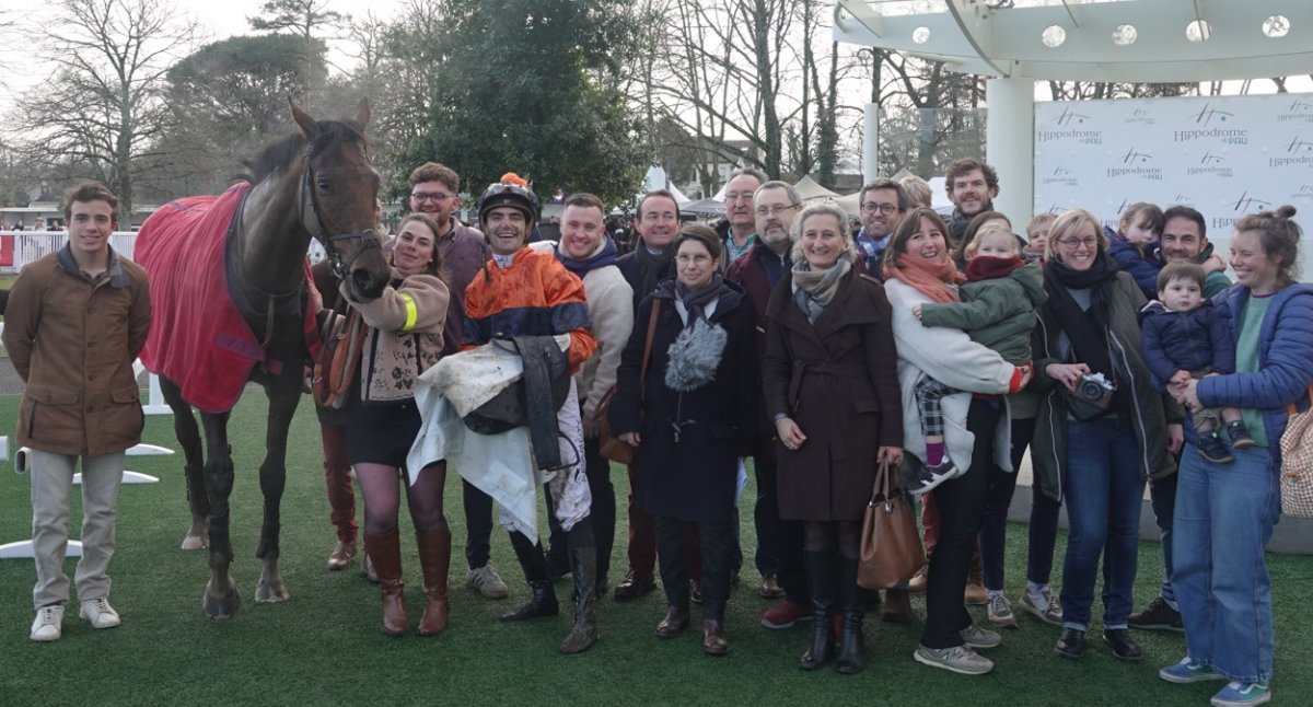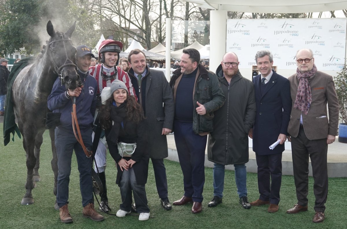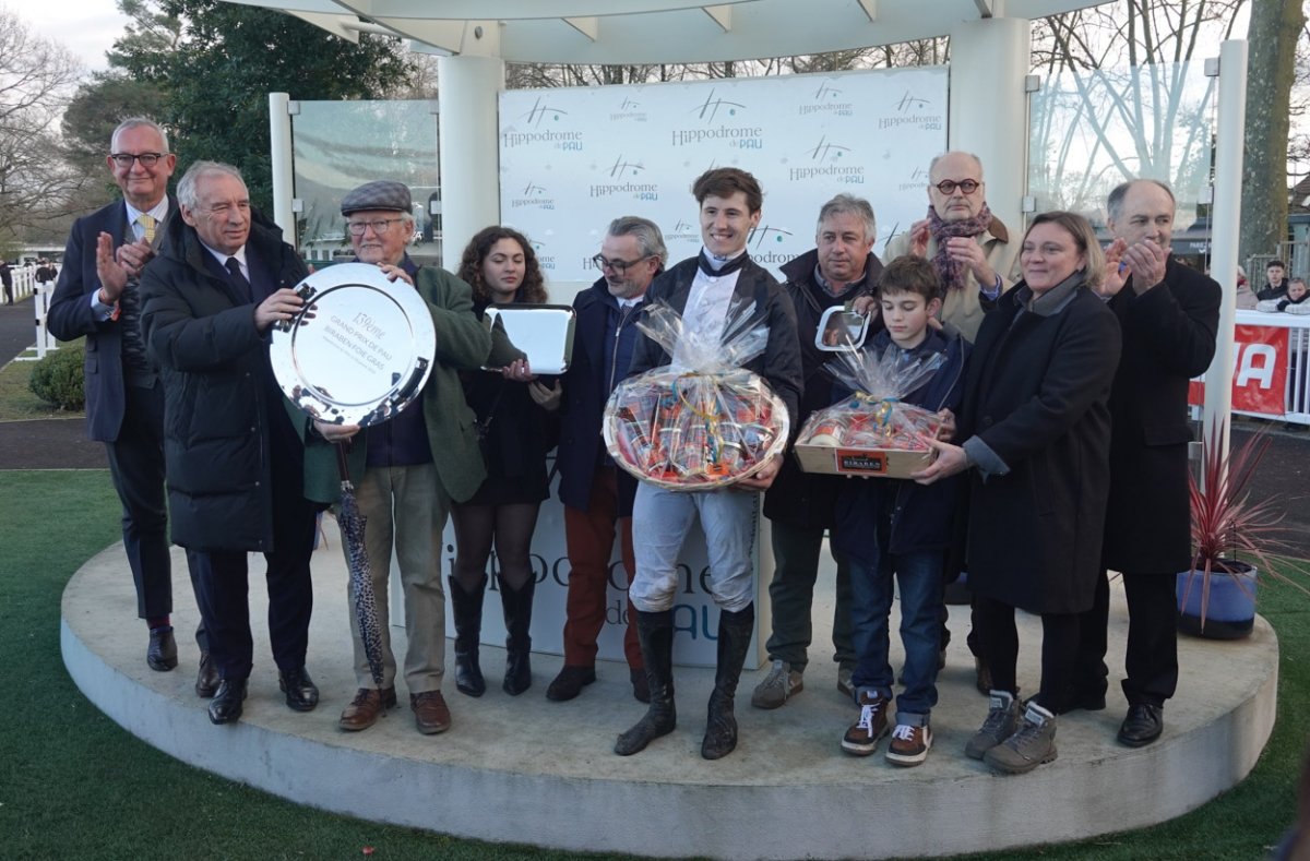 A gauche de l'image, Guillaume de Saint-Seine à coté de Francois Bayrou le maire de Pau et ancien premier ministre et à tout à droite, Jean-Louis Foursans Bourdette le président de l'hippodrome de Pau avec Fréderic Landon. Félicitations à tout l'entourage gagnant.