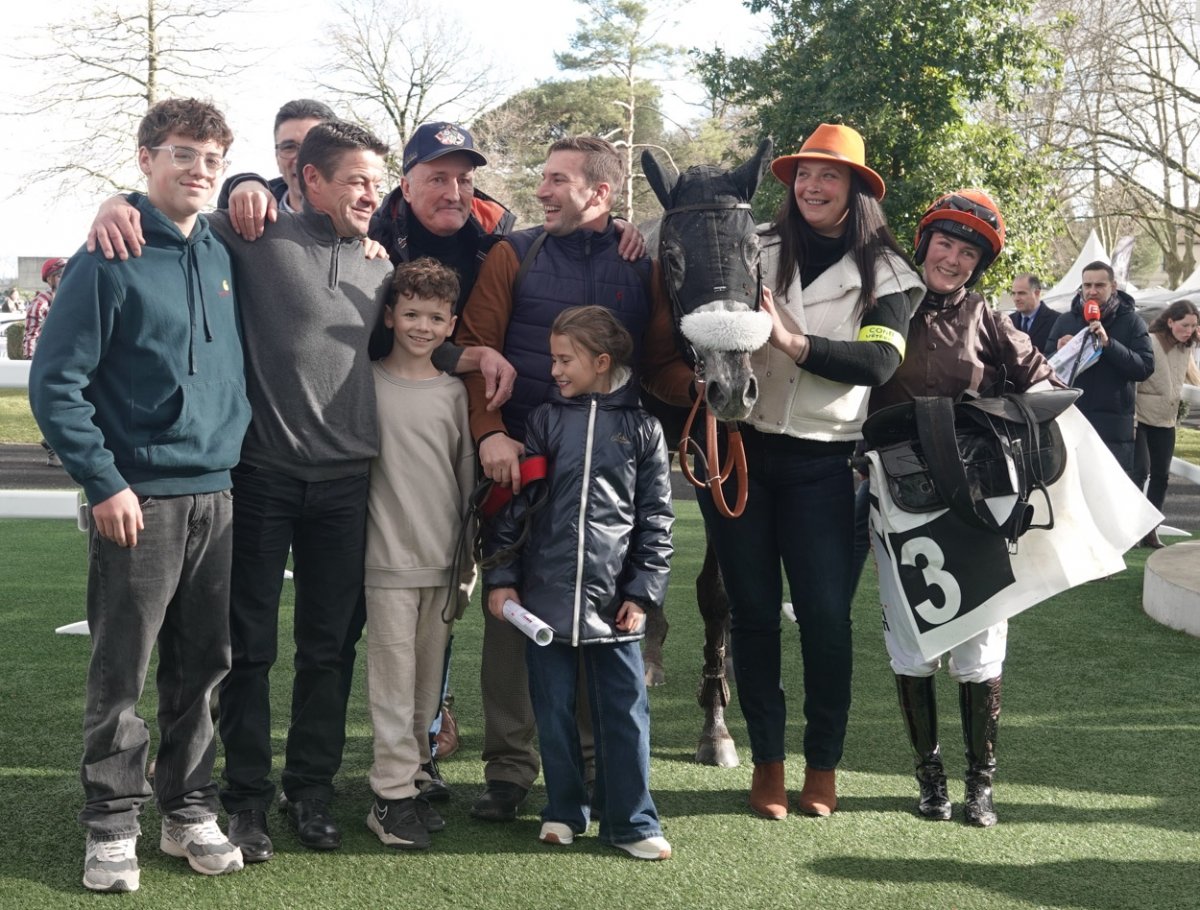 Aux cotés de Guillaume Viel, Patrice et Romain Détré et à droite, Fréderic Landon, vice président de France Galop et et Paul-Henri de Quatrebarbes, président du club des Gentlemen-Riders.