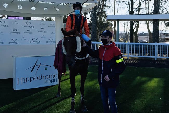 Photo souvenir, avec Erwan Bureller sur le dos de Gareth de Larachi, aux côtés du lad de ce dernier (© Twitter Hippodrome de Pau)