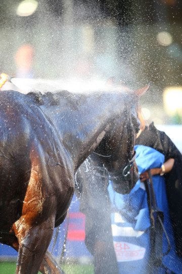 Une douche bien méritée pour Milord Thomas qui réalise le doublé Grand Steeple-Chase de Paris et Prix La Haye Jousselin dans la même saison !