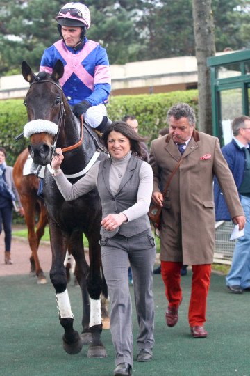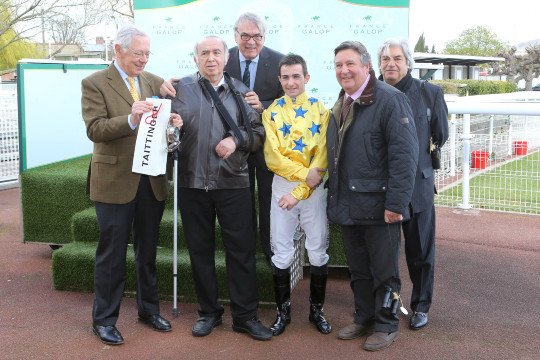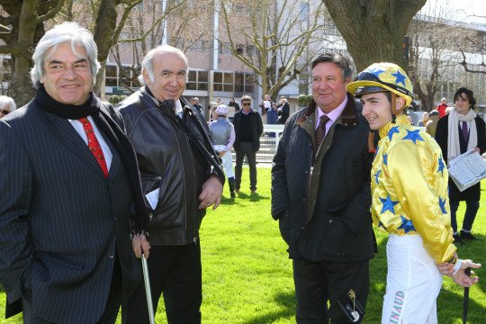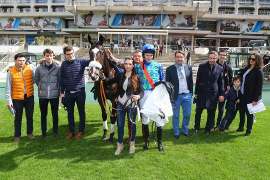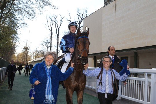 Les sourires sont encore plus éclatants après l'épreuve ! Paul Nataf (à droite) peut être heureux de son achat d'octobre 2014, aux ventes Arqana, pour 15.000 . Les couleurs de M.et Mme Jacques Cygler seront très en vue le 15 mai prochain.
