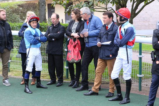 Au même moment, dans un autre style, Guillaume Macaire donne les dernières consignes à ses jockeys !