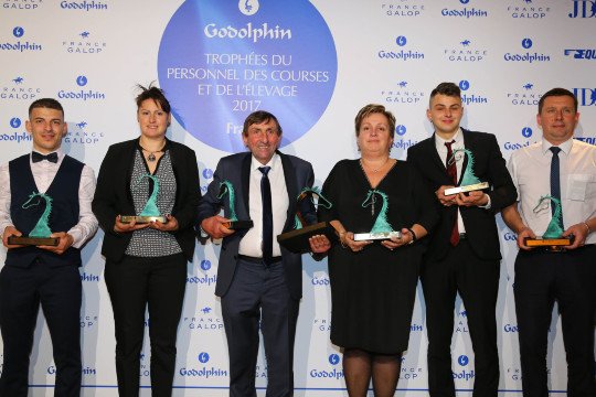 Les lauréats 2017 : Othman Ben Mosly ( cavalier d'entrainement ), Sarah le Helloco (personnel de Haras), Jean-Paul Lambert (leadership), Colette Cingal (personnel administratif), Théo Leclair (jeune espoir) et Antoine Créton (dévouement pour les courses)