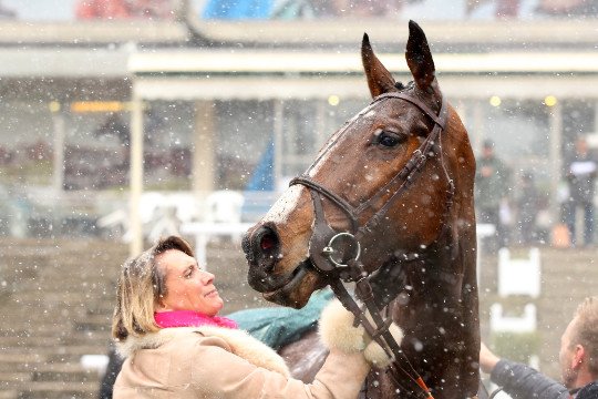 Malgré le froid, Alain de Chitray monte sans gants. Il va remporter le quinté d'Auteuil avec Red Rocky, entrainé par Jean-Paul Gallorini représenté ici par Florence, sa responsable