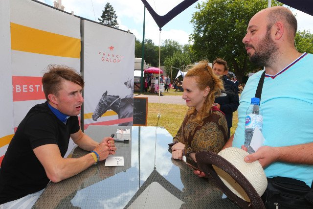 Moment de complicité entre le public et nos jockeys. Ici, Théo Bachelot en dédicace et discussion.