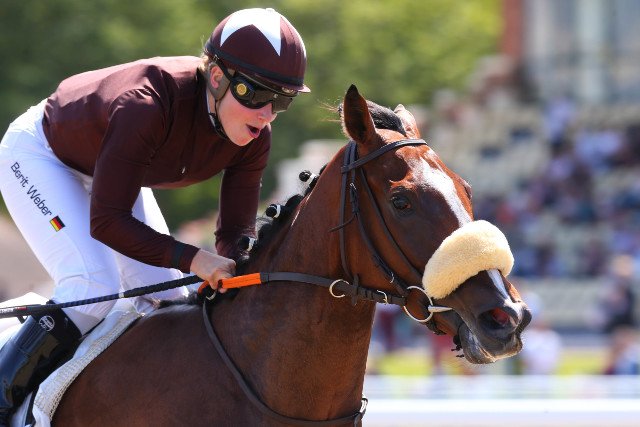 La joie se lit sur l'expression de Berit Weber au passage du poteau, en selle sur Tempête Dargent (Kendargent)