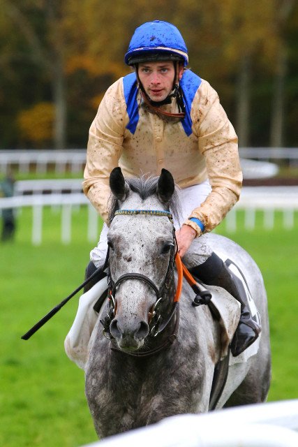 Un autre gris quasi blanc, Celtior (Racinger), samedi, à Auteuil. Il a permit à Mathéo Viel de faire sa rentrée, après pratiquement 3 mois sur le banc, suite à sa blessure aux vertèbres.
