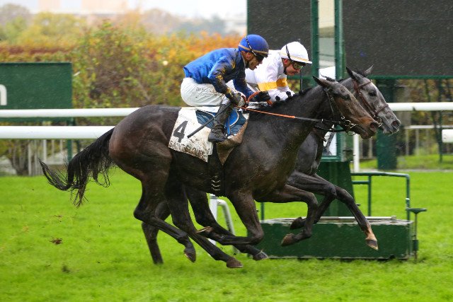 San Valentina (Tin Horse), la grise, à la corde, remporte (sur le tapis vert malgré la photo) l'un des seules 2 courses courues ce vendredi, à St-Cloud