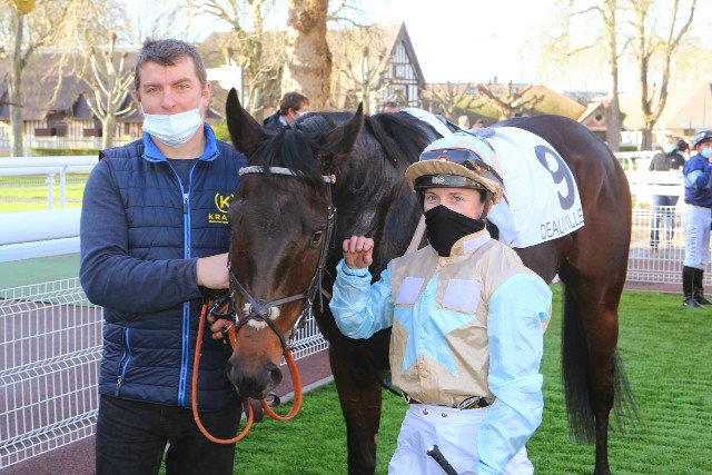 Vous ne rêvez pas, vous êtes bien à Deauville, et bien au galop, malgré cette casaque. Theory Of Time (Dubawi) fait triompher, pour la 1ère fois, la casaque du trotteur Thomas Levesque, au galop