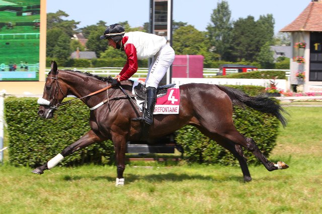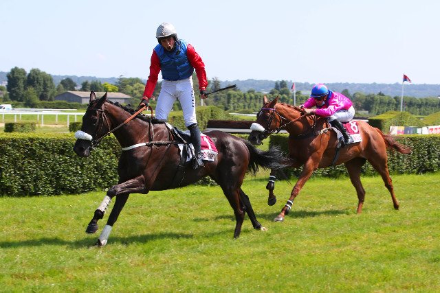 Jeudi à Clairefontaine : 3e sortie et 2e victoire de suite pour Icône d'Oudairies (Saint des Saints) à la grande joie de Baptiste Le Clerc, debout sur ses étriers. Cette nièce de Rubi Ball, défend les couleurs du Comte Michel de Gigou, son éleveur