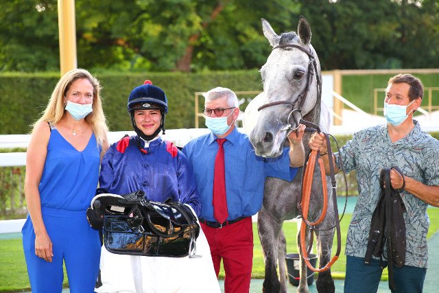 Jeudi à Longchamp : Victoire 100% féminine dans le Grand Prix des Femmes Jockeys, Quinté +. Axelle Nico et Pauline Mengès (entraîneur) posent en compagnie de Golden Rajsa (Rajsaman)