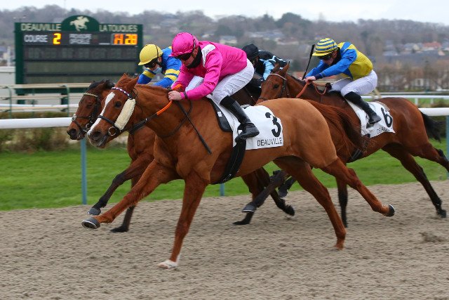 Samedi à Deauville : acquise à réclamer par Anastasia Wattel, le pouliche au drôle de nom, Mona Lisa Klaxon, s'impose avec Grégory Benoist