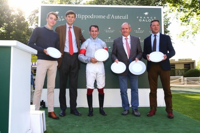 Samedi à Auteuil : Donatien Sourdeau de Beauregard, Ludovic Philipperon, Thierry Cyprès et Alix Lemaire sur le podium après avoir remporté le Prix des Drags (Gr.2), la consolante du Grand Steeple Chase Paris avec Hacienda
