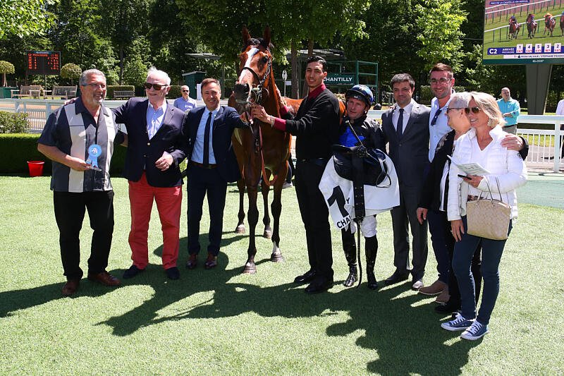 Rose Salvaje entourée de son équipe franco-française, avec de gauche à droite Francky Défossé, Frédéric Sauque, Stéphane Pasquier, Christopher Head, Guillaume Garçon, mme et Olivia Sauque, fille du copropriétaire et épouse du jockey ! Il ne manque ici que Florent Couturier à l'appel.