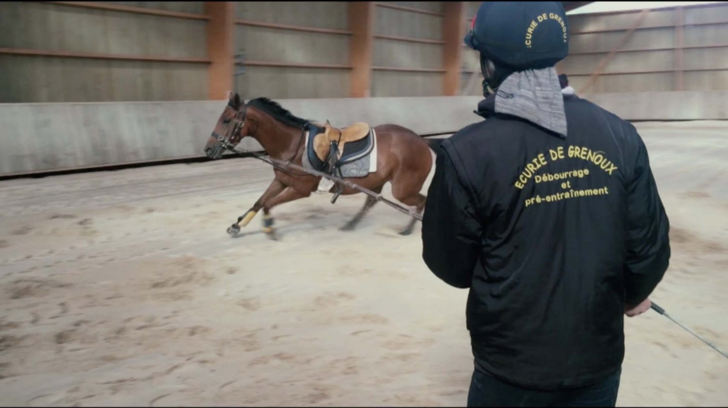 L'Ecurie de Grenoux s'étend sur 30 hectares d'un seul tenant à Saint-Berthevin, près de Laval en Mayenne. Une piste de 1200 m a été tracée avec du sable de chez Guimard. La piste est en dénivelé, avec 2 lignes droites de 400 m. Les structures ont été améliorées en 2017 avec la construction d'un vaste bâtiment abritant 31 boxes ainsi qu'un marcheur 6 places et un grand manège couvert de 1000 m2 qui permet de sortir les chevaux à l'abri même en cas de forte intempérie. Pour répondre à la demande croissante, l'Ecurie de Grenoux a ériger un nouveau barn en parallèle du premier, comme une copie améliorée. Ce nouveau bâtiment comporte 30 boxes encadrant un couloir plus large, et y sont collés 1 marcheur couvert ainsi qu'un rond de long également couvert mais très bien aéré et même arrosé automatiquement de l'intérieur !    Le débourrage est effectué par une seule personne au sol puis à cheval. Toutes les manipulations sont tout d'abord réalisées au box, puis dans le manège couvert, en reprenant à chaque fois toutes les opérations à zéro. Dès que le jeune cheval est monté, il effectue des exercices dans le manège puis dans la grande carrière extérieure, emmené par un poney leader. Une fois bien mis, le cheval pourra s'exercer et commencer son pré-entrainement.    La remise en forme, comme le pré-entrainement proprement dit, est réalisé à la carte selon les demandes des propriétaires  ou des entraineurs, au niveau du fond ou de la vitesse. La fluidité du dessin de la piste permet en effet d'avancer sérieusement les pensionnaires si le propriétaire le souhaite.     Dans le cadre d'une écurie de jeunes chevaux où les mouvements sont fréquents, l'équipe d'une 10aine de personnes porte une attention toute particulière à l'hygiène. Les nouveaux pensionnaires sont tous placés dans les boxes de quarantaine en arrivant. Les chevaux ont tous leur propre tapis et torchon de sangle, lavés une fois par semaine. De même, tous les harnachement sont désinfectés entre chaque lot. Par ailleurs, Audrey de Clerck, qui effectue minutieusement tous les soins, remplit des fiches de renseignement au quotidien pour chaque pensionnaire, au terme sanitaire, niveau de travail et comportement.  En effet, une personne s'est spécialisée dans la sensibilisation, qui permet en seulement 2 ou 3 séances de rendre un poulain serein face aux éléments extérieurs inattendus.   Capacité de 80 boxes : 1 barn de 31 boxes 3.50m x 3.50m 1 barn de 30 boxes idem Barn de quarantaine de 13 boxes entièrement rénovés 6 boxes extérieurs 1 grand manège couvert de 20x50 m 1 rond de long couvert avec arrosage 2 marcheurs automatiques de 6 places couverts 1 carrière extérieure de 30x60m 1 piste de 1200 m en sable Guimard avec 2 lignes droite de 400 mètres Clôtures Horse Rail sur toute la structure
